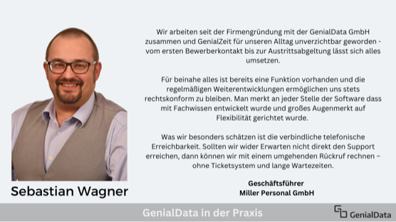 „GenialZeit ist ein äußerst zuverlässiges Tool um die vielen Aufgaben, Vorgaben, Bestimmungen und Tagesaufgaben eines Zeitarbeitsunternehmens genial und übersichtlich zu verwalten. Wir beherrschen die Überlassungsfristen, die Durchschnittsberechnung, natürlich auch alle wichtigen Verwaltungsthemen (Mitarbeiter, Kunden, Auftrag, Zeiterfassung).